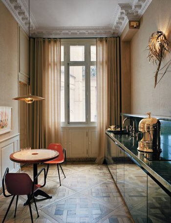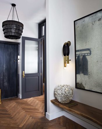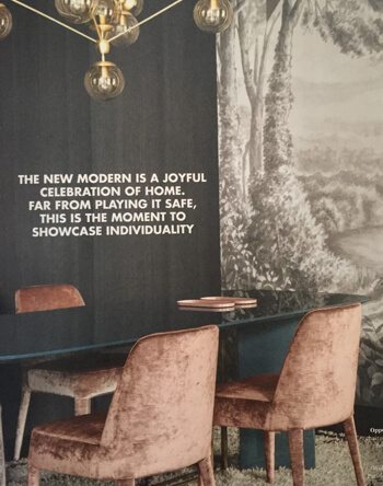 Think also Gatsby style gentleman’s room, simple lines, geometric shapes, materials such as coloured velvets, quilting, machine milled brass, onyx, gold, marble and opaque glass.