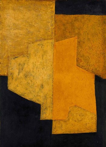 Solid colour blocks of colours in olive greens, pink, burnt orange, black, azure blue and gold.