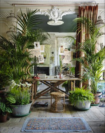 Also bohemian outdoor /indoors : Wild oversized botanicals real, faux and in printed motifs (wallcoverings, fabric, art prints), the colour green in all its forms, nomadic living with beach vibe (think Brigitte Bardot barefoot mixed with tribal patterns and rustic urns ) – low seating, bamboo furniture and woven grass/rattan/ accessories and sipping something from a handblown glass.