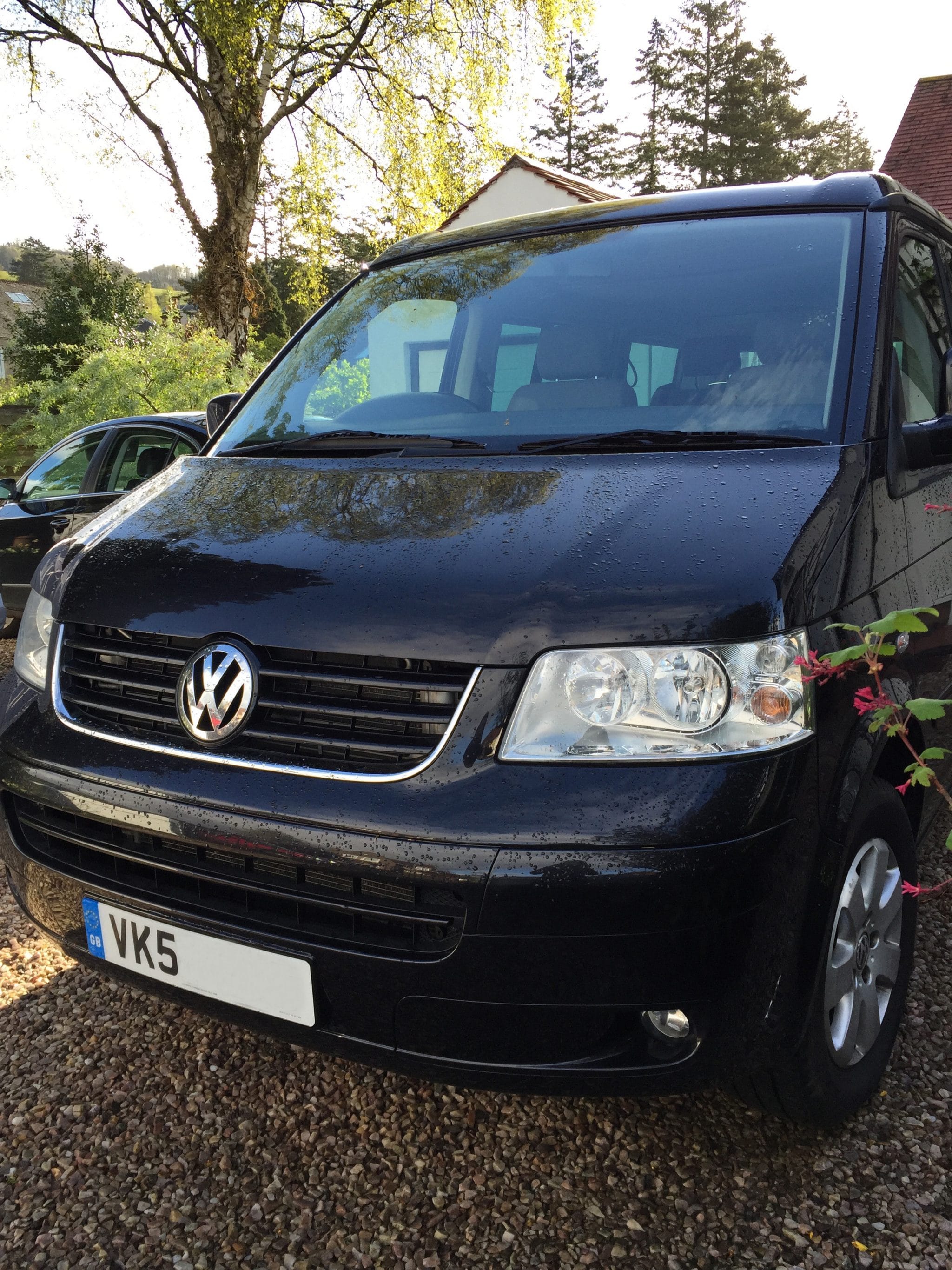 Enter ‘Vicโ – a shiny superduper ‘Buzz Lightyear’ of the camper van world, a slick black VW California! Now please understand, this is a bit of a lifelong fantasy for Roddy, he has had a long love affair with VW campers, his first being an old yellow T25 similar to Martha that he bought when he returned after a Australian gap year to start work in Glasgow city centre where he didnโt need a car. Many of our early dates were spent with him waxing lyrical about his old van, its special stripey pop up roof and the familiar smell of the rumbling oily engine. He got me hooked, literally! His dream has always been to drive a T5 – even for just a day- and here we are with our very own to take us round Europe, its a special moment!