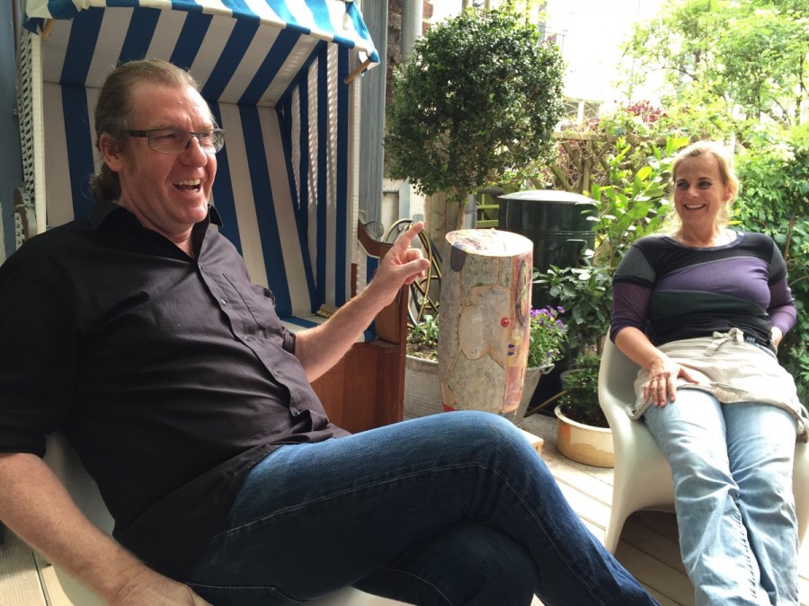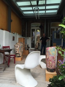 Ines and Christoph moved to Seigburg sixteen years ago into what was originally an old delapidated building. With a lot of hard work, ambition and imagination they have created an amazing pad here – one that incorporates a streetfront gallery, internal design studio, open plan workshop and upstairs living area. The space in which we’re standing is mesmerising. Its neither indoor nor outdoor and has a fabulous industrial vibe with heavy steel beams and exposed brick. Translucent panels in the flat roof canopy let the sun pool onto the wide floor boards that edge out into the small but lush garden area. Dotted around are one or two funky chairs, large leafy plants and some mismatched wooden furniture that gives the space a hip yet relaxed atmosphere.
