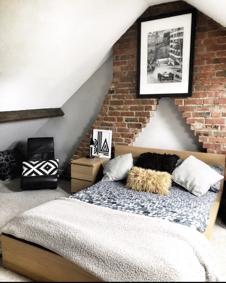 Our loft room is probably my favourite of our interior projects because it was done at a very stressful time in our lives and on the smallest budget imaginable, which was extremely frustrating and miserable at times but I look back with pride now at a great space created out of very little. Every ounce of ingenuity and imagination had to be used to come up with the cheapest option without compromising too much on style. I won’t lie, it’s not how I would have it if money was more freely available, the fixtures and fittings would be much better quality and I don’t love the furniture, but its good old Ikea and it’s what my son chose at the time and of course it was in our budget!
