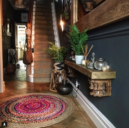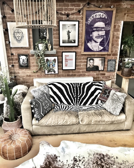 This weeks style warrior has built a home that I feel is centred so much around nurturing. From her work in maternity to babysitting her grandchildren to looking after her lovely dog, she is someone who naturally seems to make people feel calm and relaxed. Her home absolutely matches her personality which as an Insta-mate I can say is so kind, friendly and up for a laugh. Cosy layered textures, natural wood, colourful textile weaves and silky sheepskins draped so invitingly along with twinkly candlelight welcome you in to her home and yet the art that animates very inch of wall tells of another quietly cool and anarchic side. It has a stylish yet relaxed bohemian vibe and you just know you could come as you are and hang out with her on a Friday night over a glass of wine and a spag bol – putting the world to rights! Enter the very lovely Danielle Le Petit or (@daniellellp on Instagram) to tell her interiors story…..