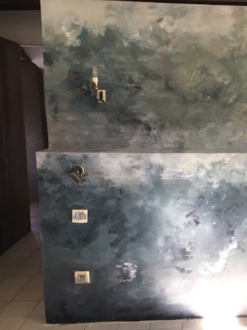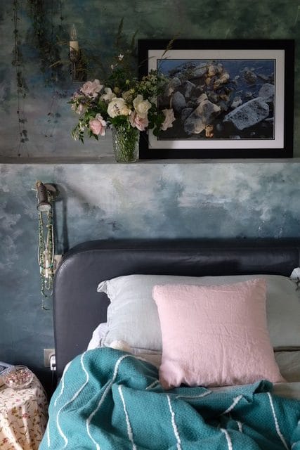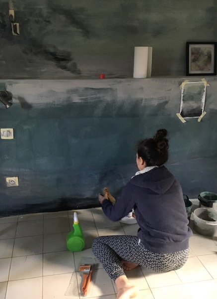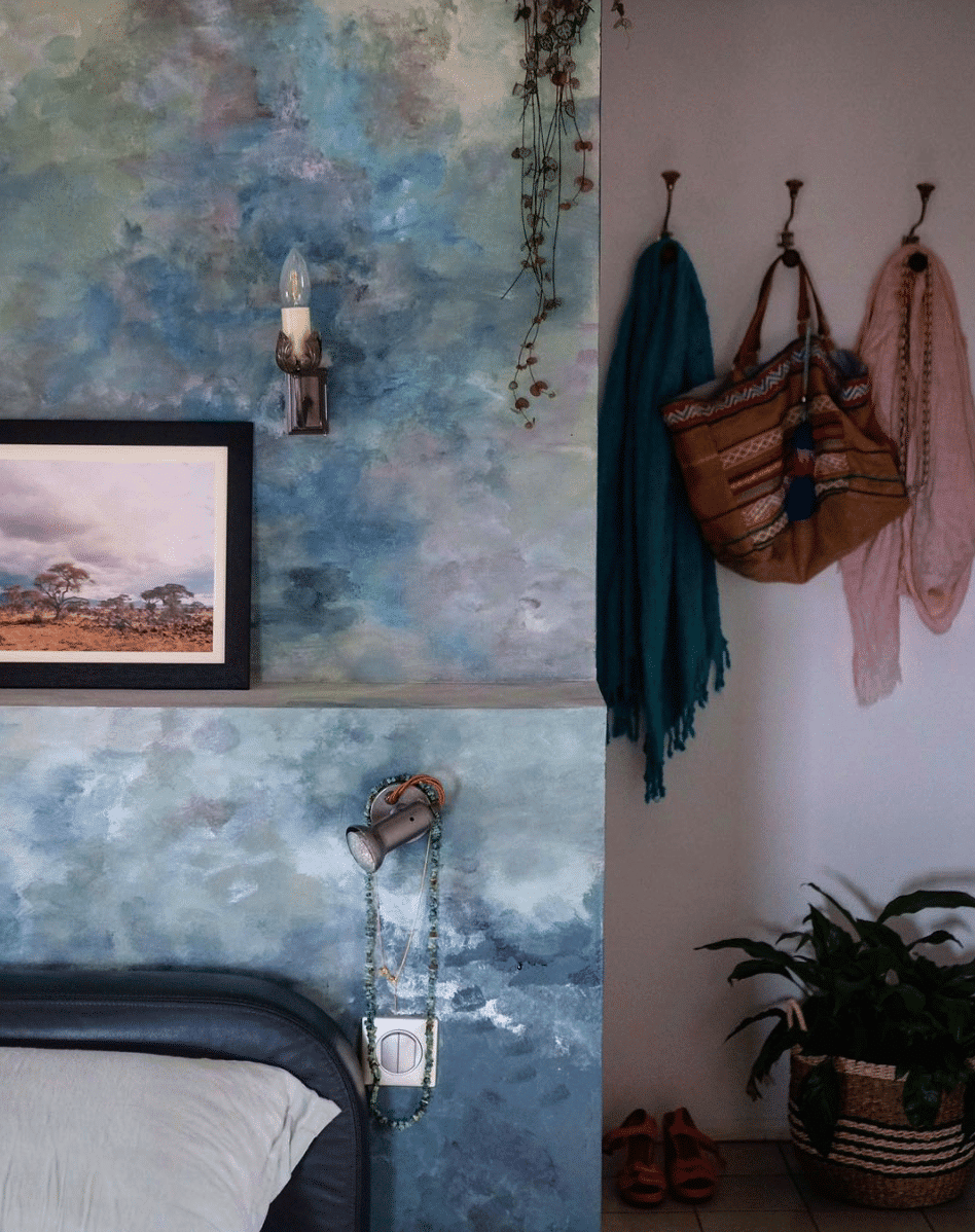 My other more recent smaller scaled interior project was my bedroom wall. It was in desperate need of a repaint. I thought about wallpapering it but somehow it seemed like it would be out of place with the rest of the house. So I set about making my own feature wall using all my left over tester pots and half pots of paint (of which I have many) using rags and sponges and brushes. I did a mock up on a piece of A4 and then enlisted the help of Kitty (my 13-year-old) and gave it a go. I used some polyfilla to add a bit of texture here and there. We added some loud music and had some fun.