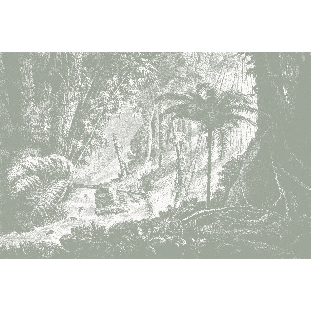 A romantic grey tropical wall mural| set deep in the Amazon jungle. Palm fronds| foliage and trees feature in this rainforest wallpaper mural| creating a design perfect for a feature wall in a bedroom or living room.