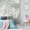 A romantic grey tropical wall mural| set deep in the Amazon jungle. Palm fronds| foliage and trees feature in this rainforest wallpaper mural| creating a design perfect for a feature wall in a bedroom or living room.