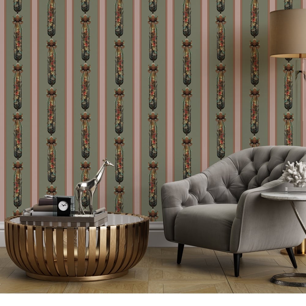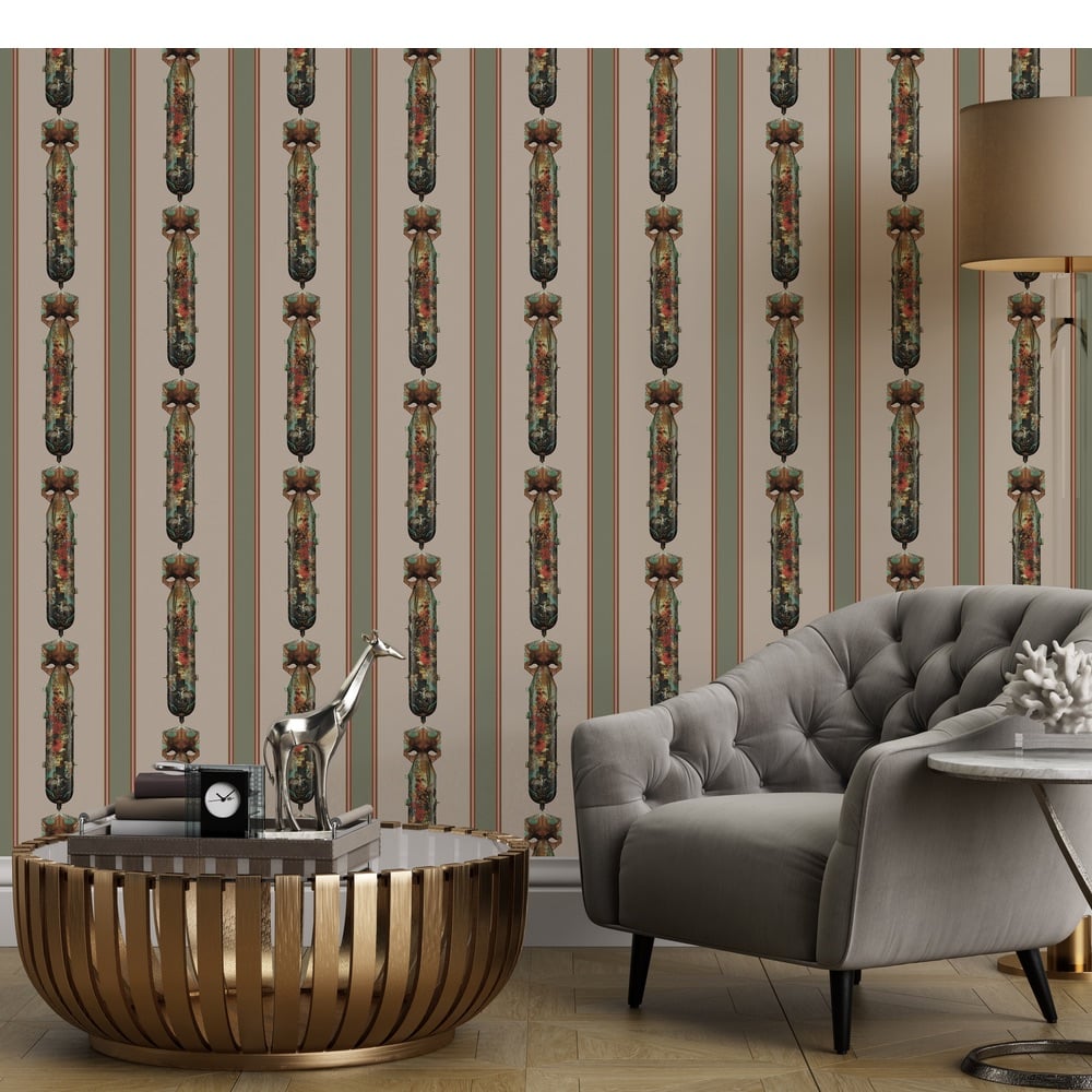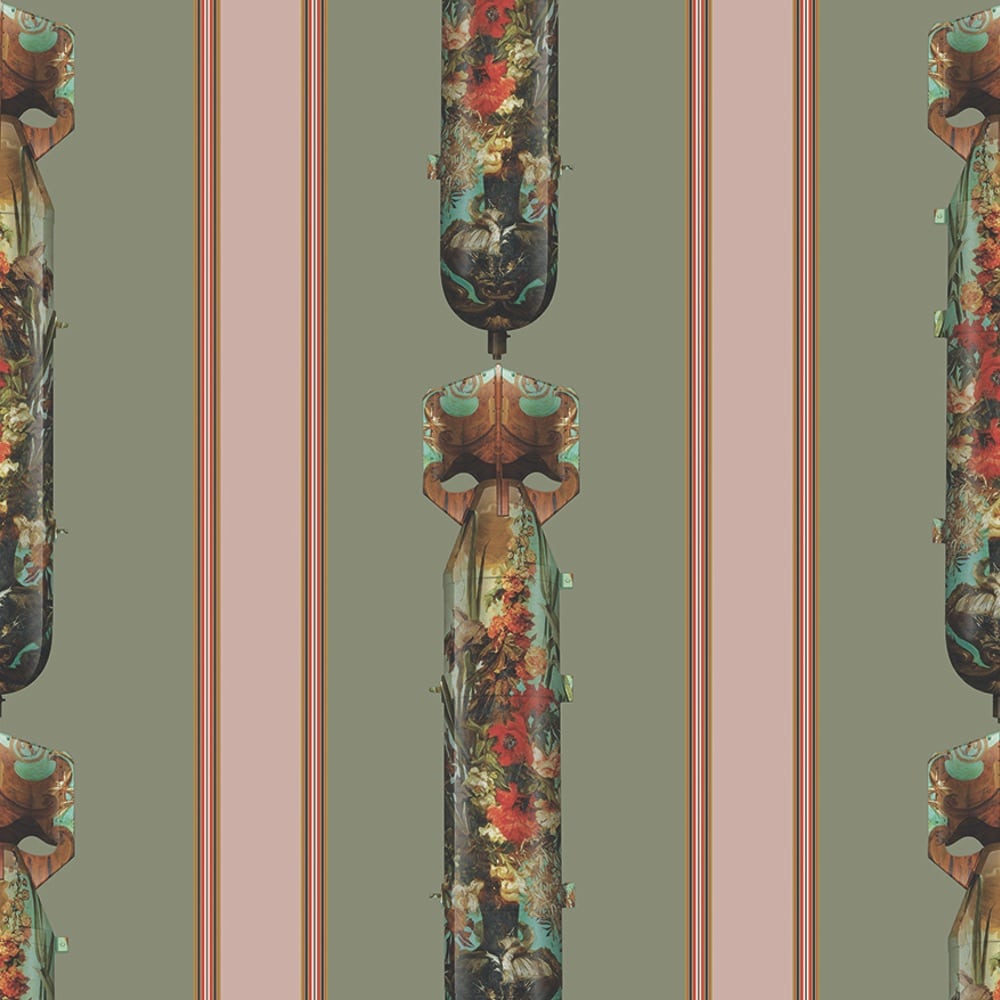 Flower Bomb wallpaper takes a formal Georgian striped design and add a touch of humour and complexity into the mix. The larger stripes of the cream flower bomb wallpaper feature a stylised bomb against a tranquil background as a way of showing how extremes often occur simultaneously in human existence. This paper would certainly provide a talking point in a dining room or hallway and is both bold and classical at the same time.