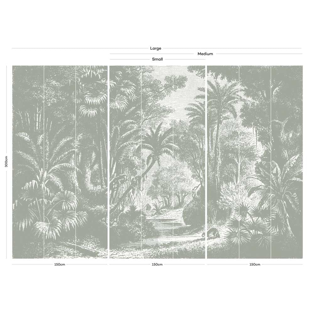 A statement jungle wallpaper mural| set in the lush foliage of India. An animal approaches a pool to drink| surrounded by palm trees and rich jungle foliage| creating a unique monochrome tropical wall mural perfect for a feature wall in a bedroom or living room.