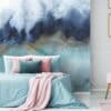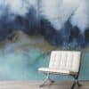 A stunning abstract wallpaper mural by painter Jen Merli| with intricate detailing shown in the gold colour that flashes across the teal and grey watercolour background.