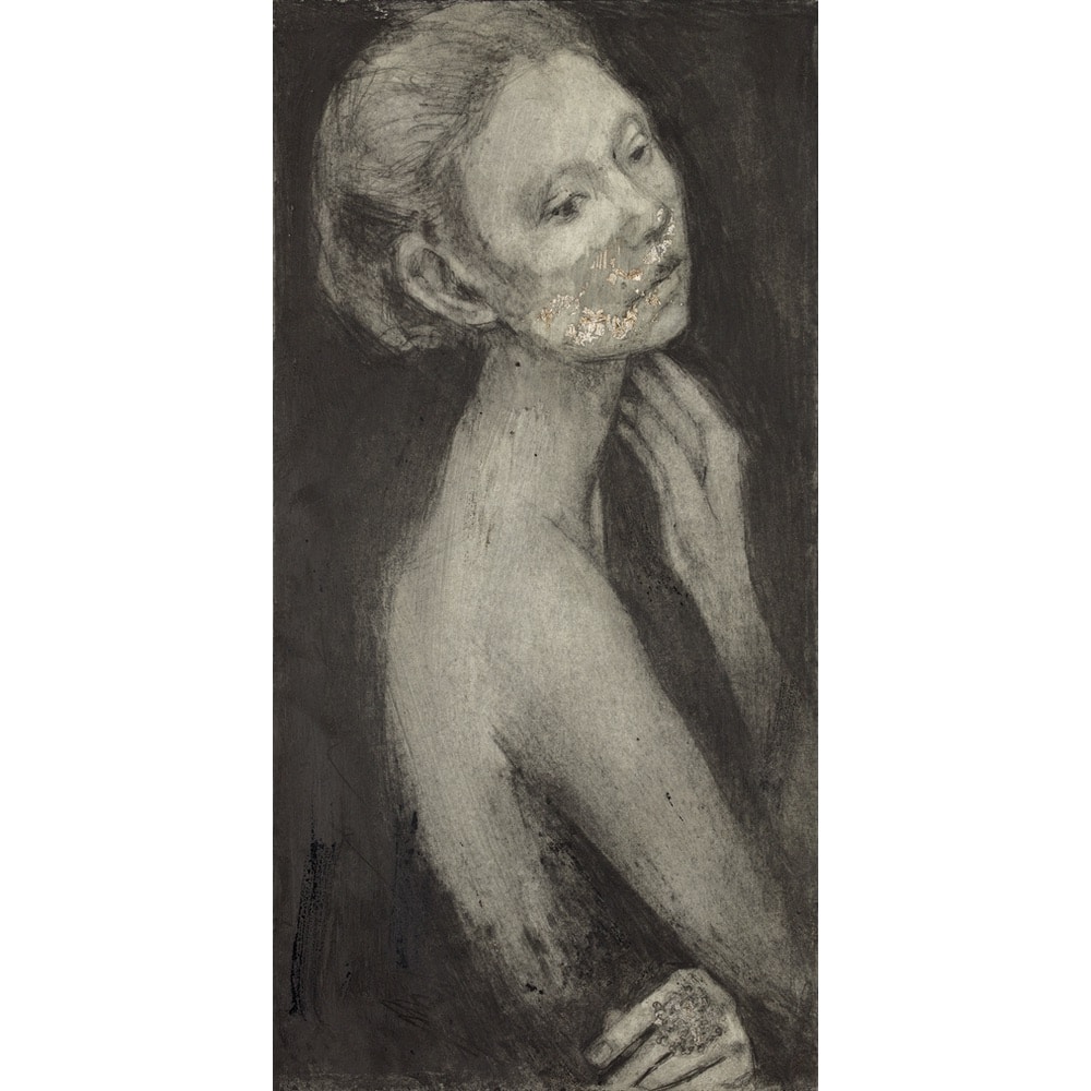 “I wanted to capture a simple pose focusing purely on hands and faces because this is how we express our feelings. These works begin with a simple pencil drawing and more graphite is added and layers of beeswax, this adds depth and makes them more ‘alive’. I add a hint of a silver mask using real silver leaf, during the plague it was discovered that the wealthy ate from silver platters and managed to avoid becoming ill due to the anti microbial properties of the metal. I use real silver leaf with the graphite and beeswax, all elemental and natural materials. The subject in each image wears a prominent silver ring in the shape of the virus to act like a totem or protective talisman.” Gill Walton