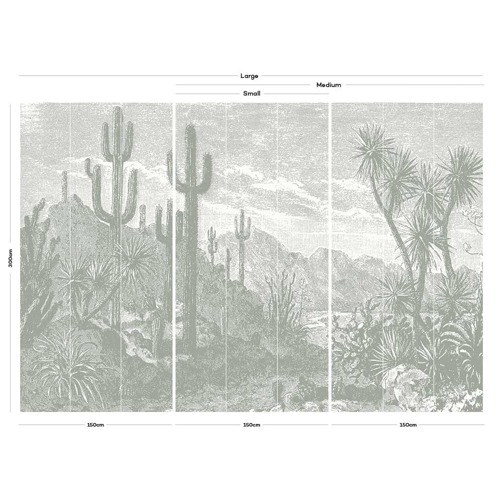A calm cactus wallpaper mural. Cactus plants and palm trees are set against a mountain landscape in this vintage mountain wall mural| evoking a desert oasis in the Americas.
